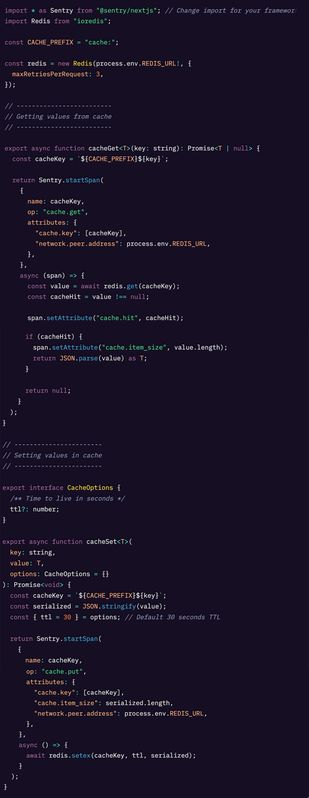 やるべきことは、redis.get と redis.setex を Sentry.startSpan でラップし、キャッシュ専用のスパン属性を付与するだけです。バックエンドで JavaScript を使っていない場合でも、選んだ言語でこれらの関数を書き直せば問題ありません。正しい op と属性を持つスパンを送っている限り、キャッシュのインストルメンテーションは正しく行えます。