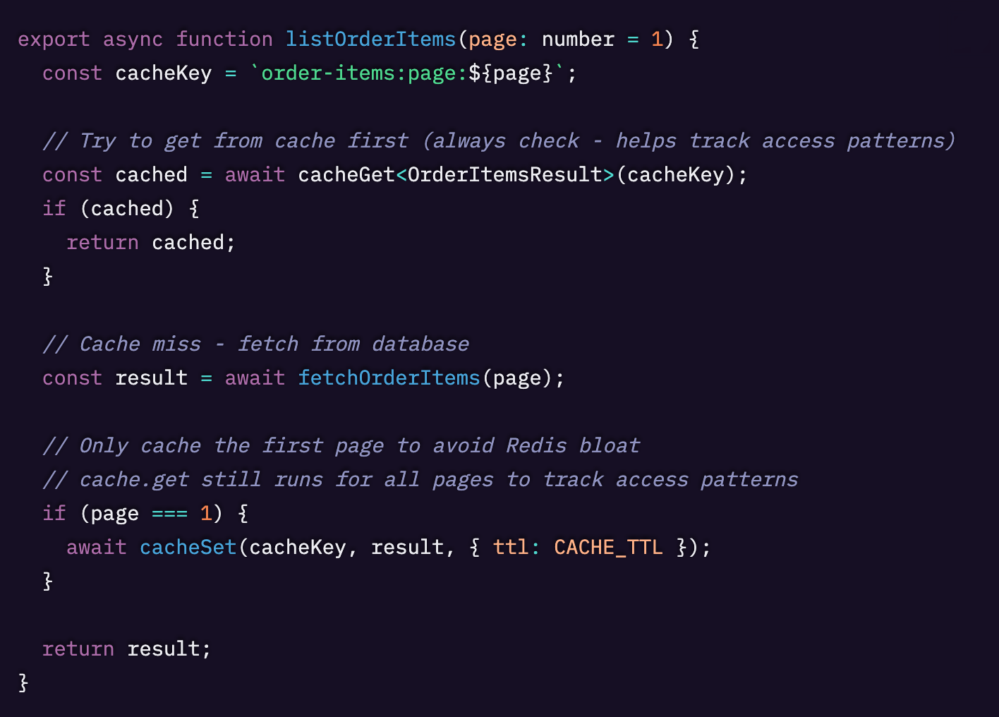 つまり、データベースに到達するのはおおよそ3リクエストに1回だけ、ということです。ただし、Redisのメモリにも注意を払うことが重要です。キャッシュ対象を1ページ目から3ページ目まで押し広げると、Redisインスタンスが肥大化する可能性があり、その場合キャッシュは見合わなくなります。Redisの肥大化=ホットパスのエビクション(追い出し)であり、言い換えると、そもそもキャッシュで得られたパフォーマンス向上を打ち消してしまうということです。