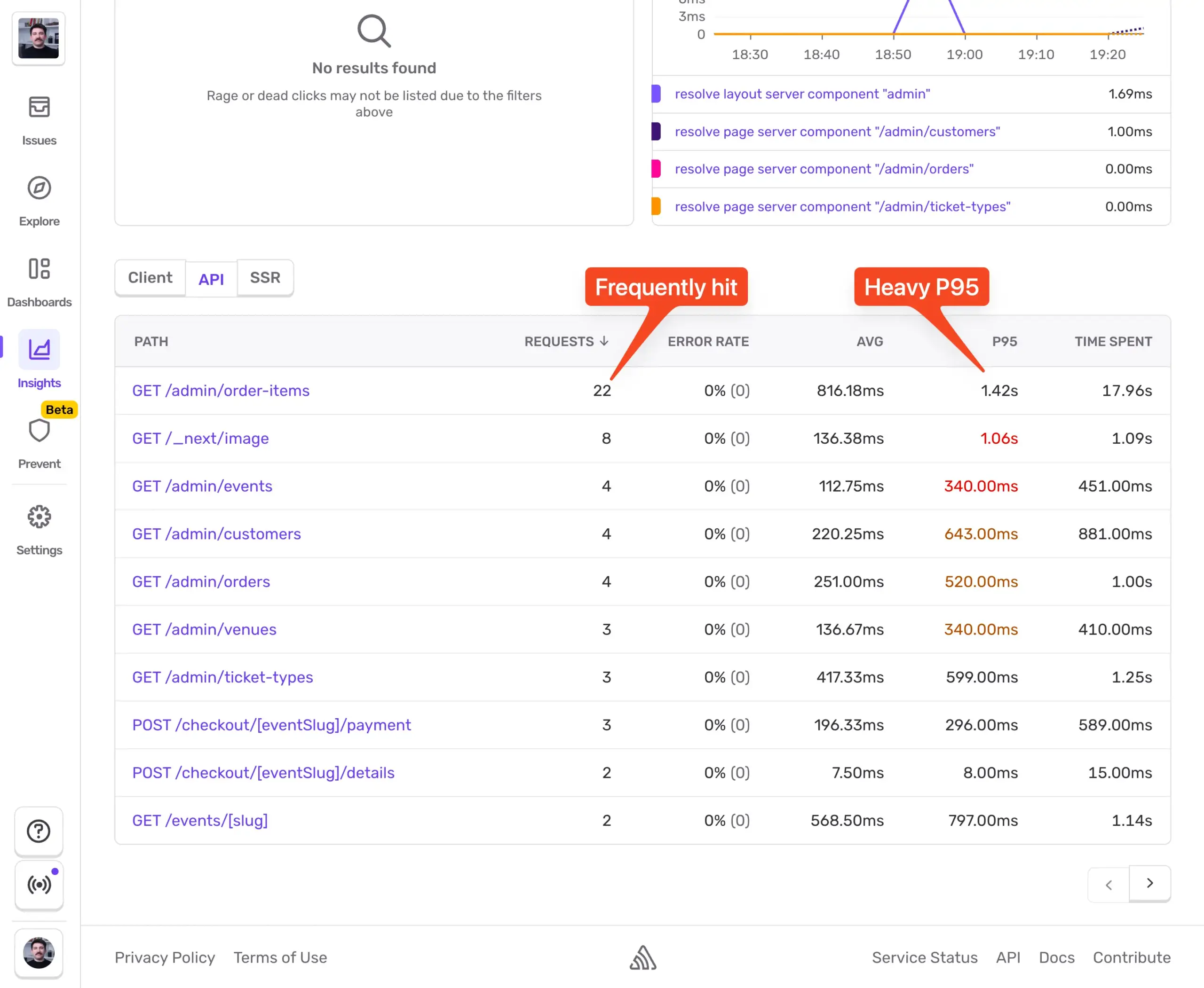 ページの読み込みが遅い、ぎこちないインタラクション、タイムアウト。 Web Vitals のような、Time to First Byte (TTFB)、Largest Contentful Paint (LCP)、および Interaction to Next Paint (INP) などは、バックエンドの遅さが実際にユーザーに影響を与えていることを確認するのに役立ちます。これらは、すでにバックエンドにボトルネックがあると疑った場合に特に有用です。