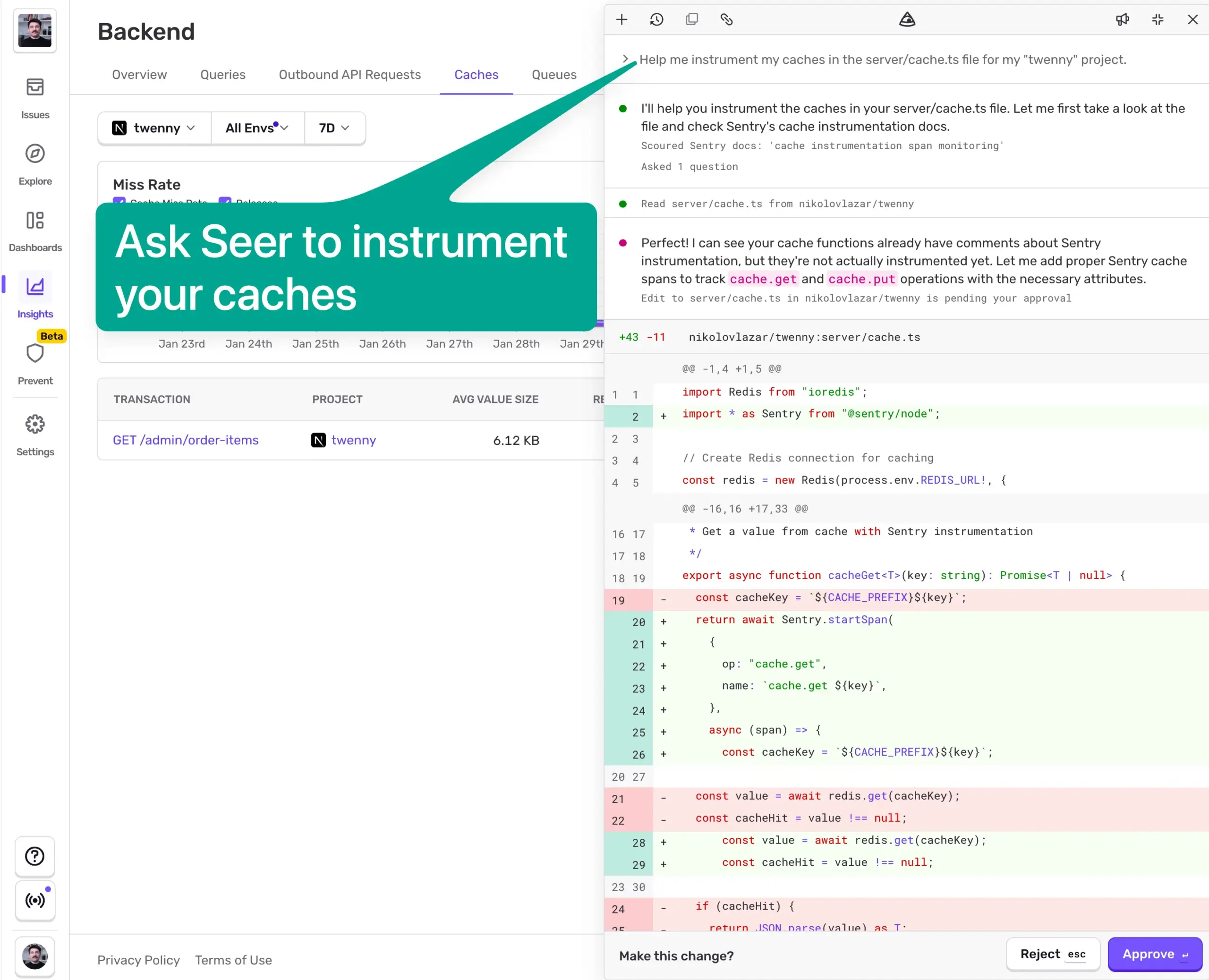 最も手っ取り早い方法は、Seer にやってもらうことです。この記事の公開時点では Seer の「オープンエンドの質問」機能はプライベートアクセスのみですが、少しだけお見せします。Cmd + / でアクセスでき、キャッシュの計装をリクエストできます。