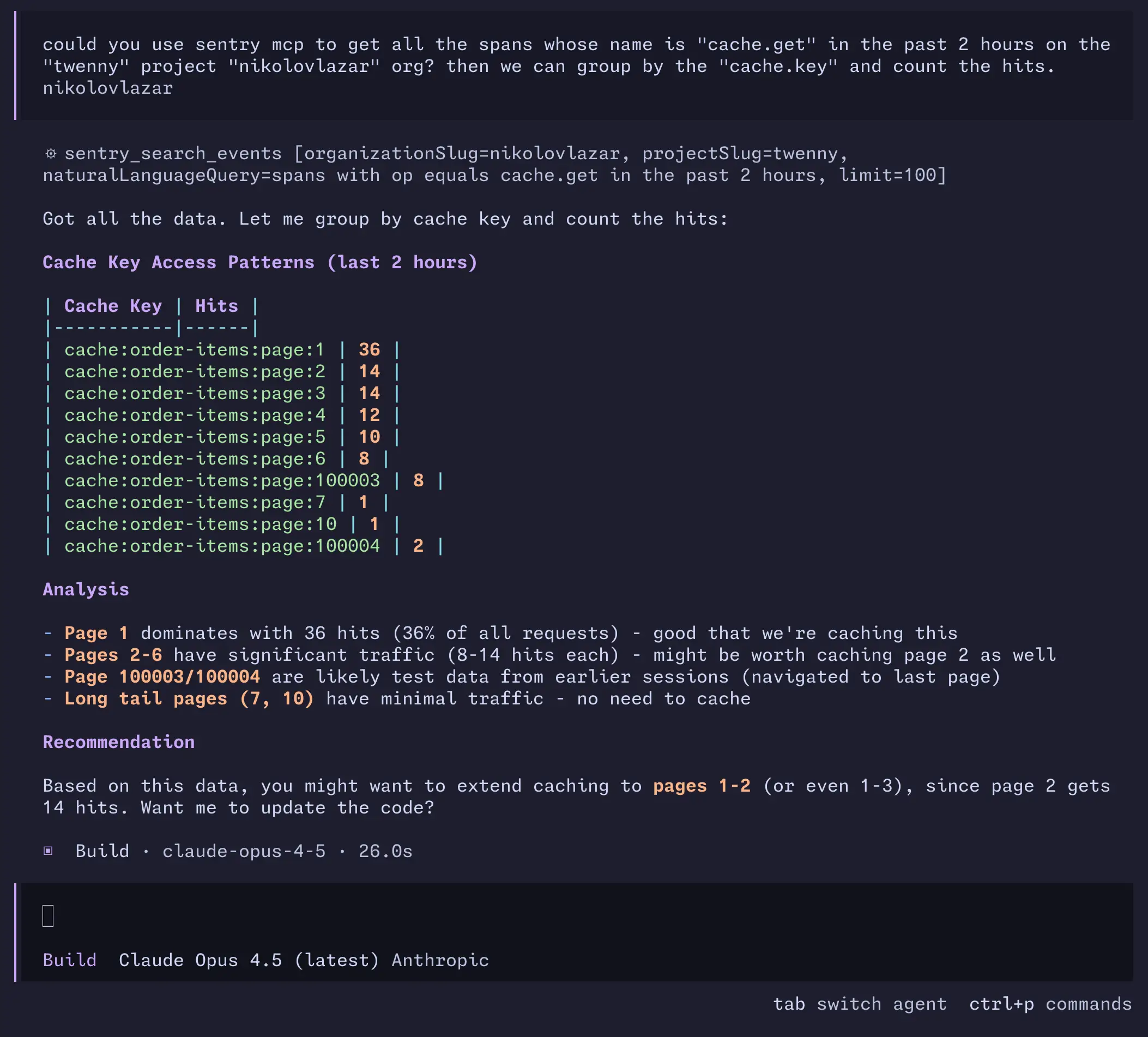 Sentry Model Context Protocol(MCP)を使うと、プロジェクト内の cache.get スパンをすべて取得し、cache.key プロパティでグルーピングできます。そのうえで、キャッシュをどのように拡張できるかをエージェントに提案してもらうことも可能です。