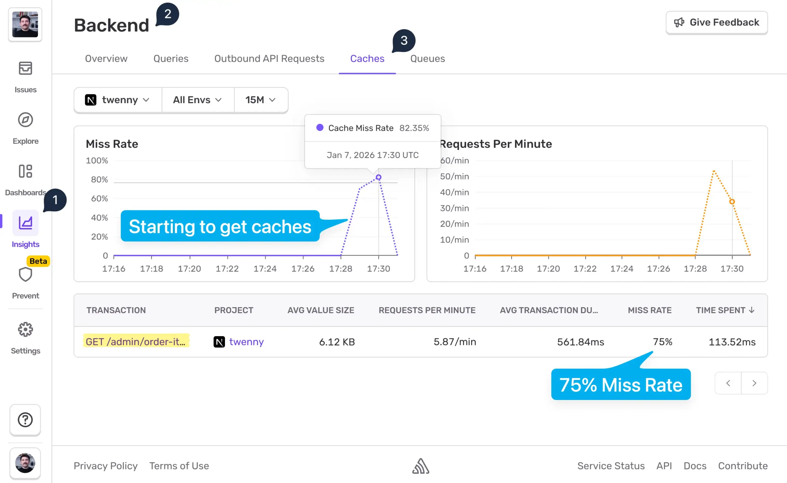 Sentry にはキャッシュモニタリング機能もあります。これにより、アプリケーション全体のキャッシュヒット/ミス率を確認でき、キャッシュがヒットした場合もミスした場合も、本番環境で取得された特定のイベントを調べられます。