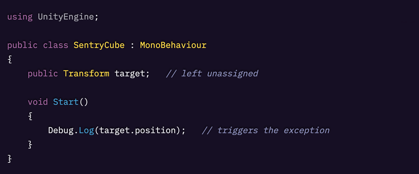 Start() が実行される時点で target は null のままなので、position への呼び出しが失敗し、Unity は処理を止めて上記の UnassignedReferenceException メッセージを表示します。