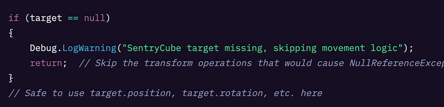 このコードで SentryCube を動かすと、リストにアクセスする前にインデックスを確認します。インデックスが範囲外の場合は、Unity にエラーを握りつぶさせてしまうのではなく、警告をログに出します。これにより、UI 要素が欠けたり、想定外の挙動が発生したりといった、分かりづらい問題につながるのを防げます。