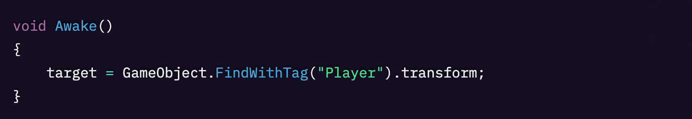 - public Transform target フィールドが Inspector で一度も設定されておらず、変数が「何も参照していない」状態になっている