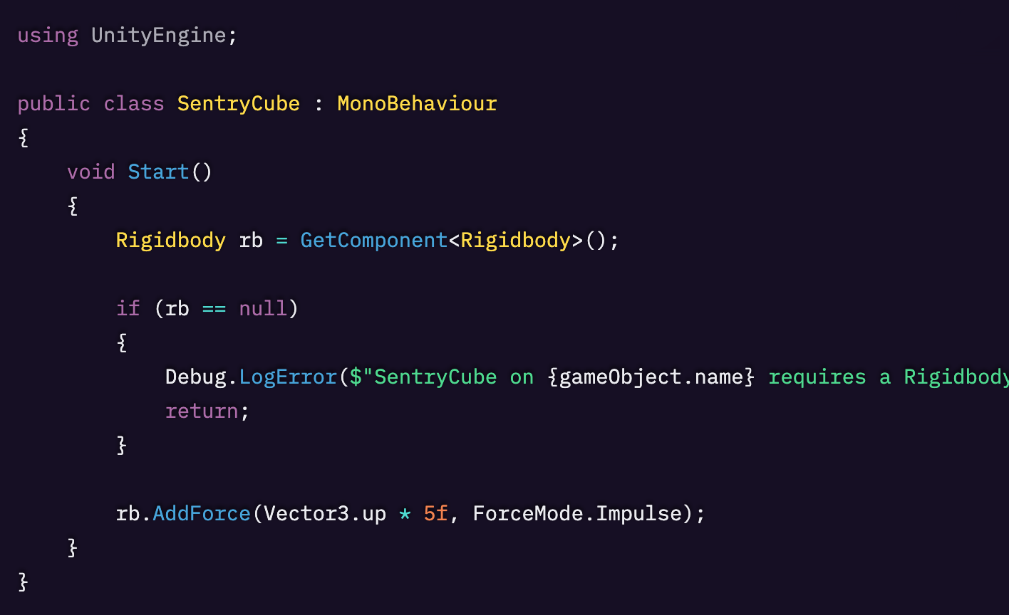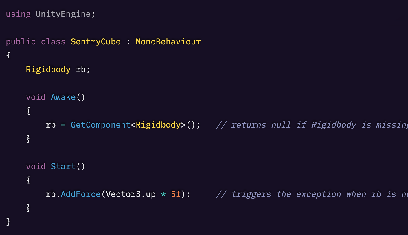 SentryCube に Rigidbody コンポーネントが付いていないため、AddForce の呼び出しは参照先が null の状態に当たり、Unity は上記の MissingComponentException メッセージとともにエラーを投げます。