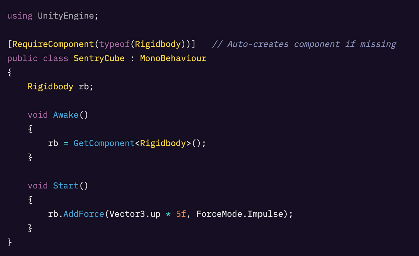 ただし、[RequireComponent] は問題を見えにくくすることがあります。というのも、コンポーネントを デフォルト設定のまま自動生成してしまい、意図した構成と一致しない可能性があるためです。たとえば自動で追加された Rigidbody の mass / drag / constraints が想定と違い、予期しない物理挙動につながることがあります。