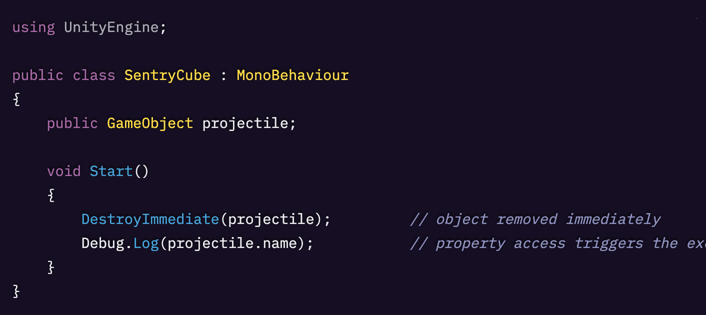 DestroyImmediate(projectile) はオブジェクトを 即座に削除します。projectile に残っている参照は一見まだ有効に見えますが、そこに対して何らかの呼び出しを行うと MissingReferenceException エラーが発生します。