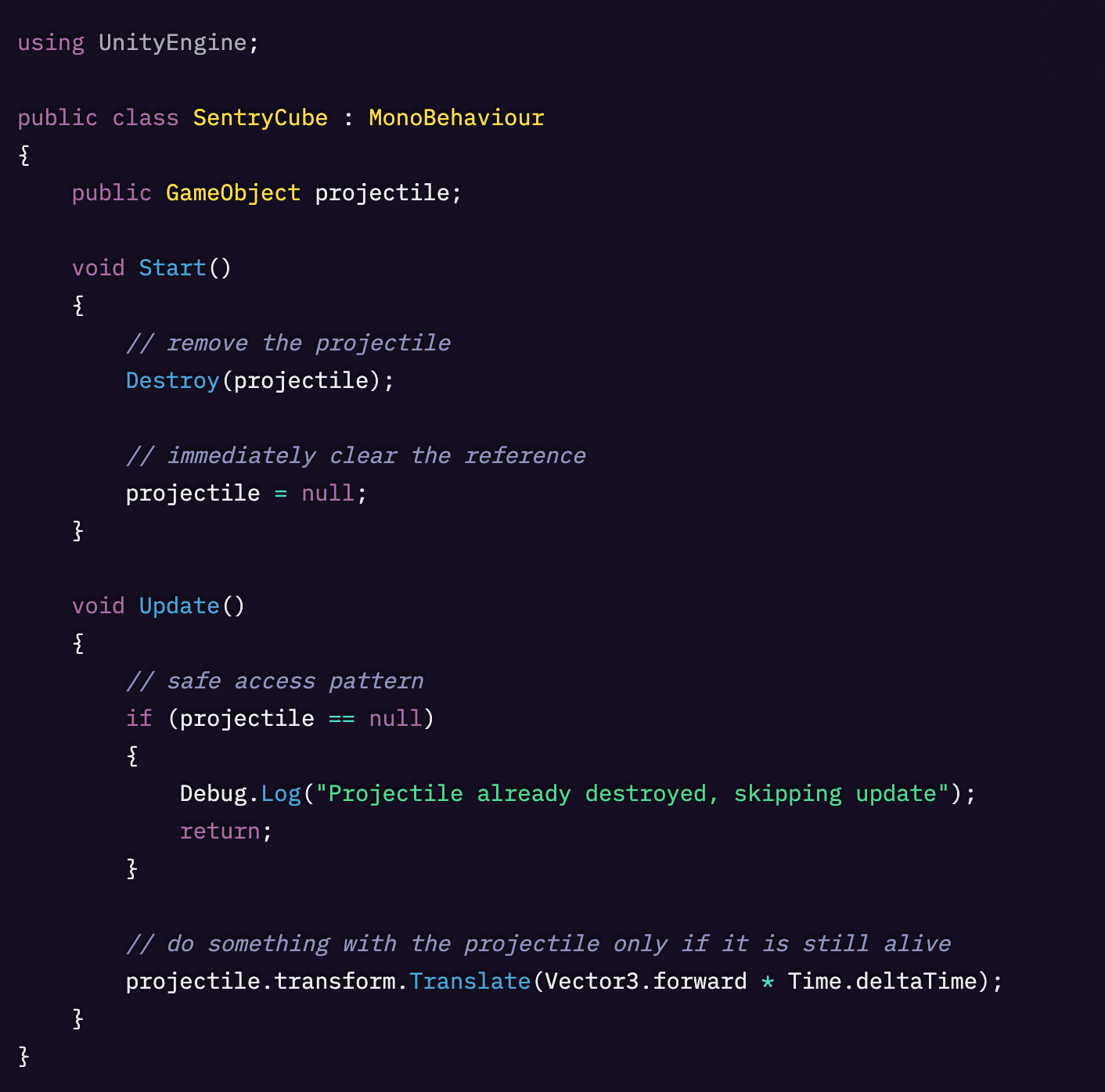 この方法では、projectile を破棄したうえで projectile の参照をクリア(null に設定)し、アクセスする前に null 参照チェックを行います。これにより MissingReferenceException を防ぎ、コードの堅牢性も高まります。