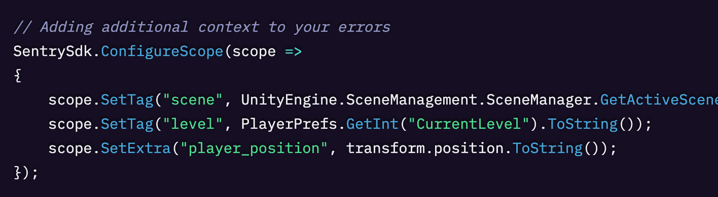 Unity ゲームのエラー監視に Sentry を活用する方法をさらに知りたい場合は、Unity におけるエラー/クラッシュレポート向けに Sentry を使うガイドをご覧ください。あわせて、Sentry がゲーム開発者をどのように支援しているかも確認できます。Sentry Unity SDK を始めるには、ドキュメントを参照してください。