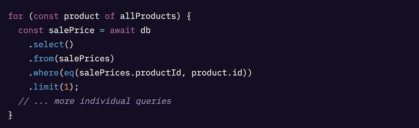 こう実装したのは、そのほうがシンプルだったからです。まず全商品を取得し、そのあとループで各商品のセールデータを取得する。見た目にもコードはきれいで、テスト商品が 5 件のときには完璧に動いていました。