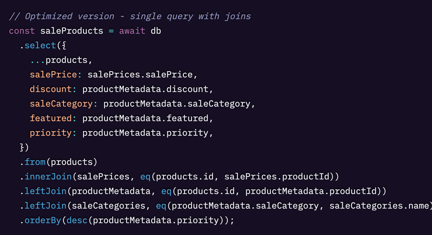 まず最初に全商品を取得するクエリが 1 回実行され、その後に各商品のセール価格、メタデータ、カテゴリ情報を取得するクエリが何度も繰り返し実行されています。典型的な N+1 です。
