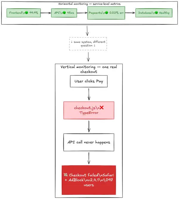 コンバージョン率が12%も下がってしまいました。マネーモーメントである「購入手続きの完了」が、特定のブラウザ拡張機能を使っているユーザーで機能していませんでした。サーバーエラーはなし、アラートもなし。3週間分の売上を失いました。修正にかかったのは1時間ですが、問題に気づくまでには非常に長い時間がかかりました。