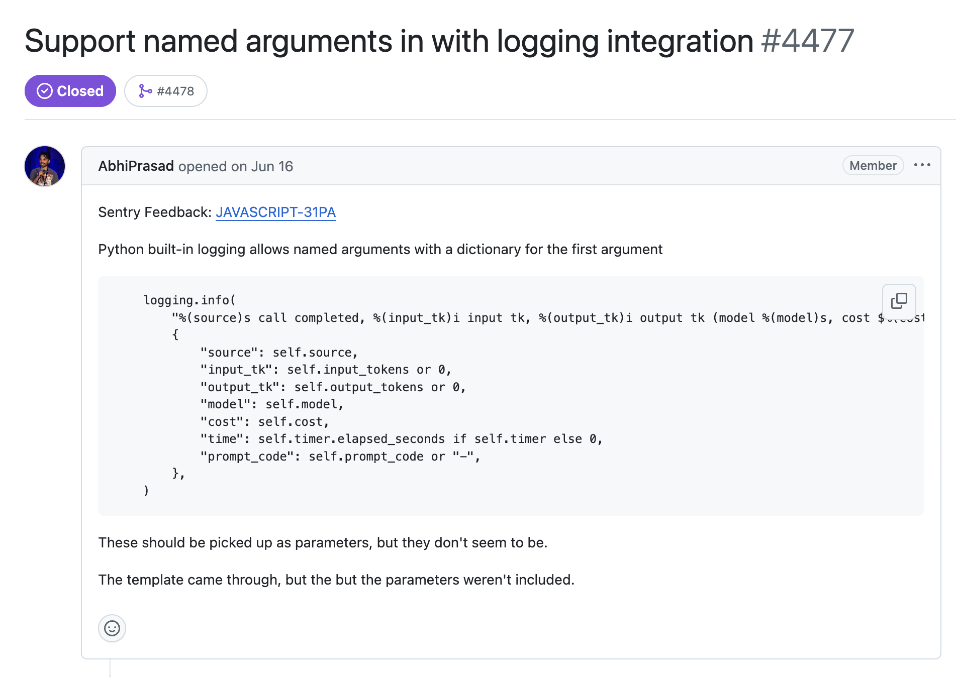 - Python SDK のバグ:ログ属性を正しく収集していなかった。Python 標準ライブラリのロガーとのログ統合を最初に実装したとき、生成されたログメッセージに名前付きパラメータを付与していませんでした。この API がそのようにも利用され得ることを、ユーザーから指摘を受けるまで気付いていませんでした。