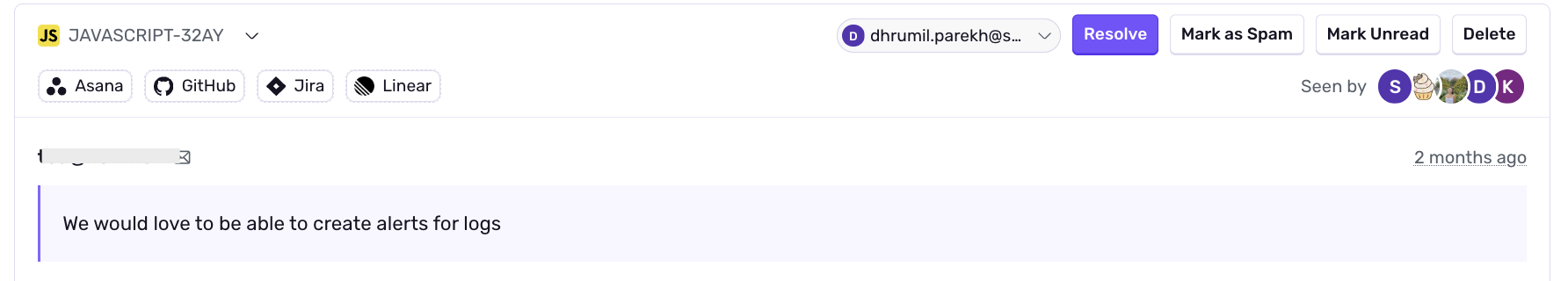 数か月前に Logs のベータ版をリリースしたとき(ちなみに先週 GA になったのでぜひご覧ください)、私たちはエラーやパフォーマンス監視だけでは明らかにならないもの(壊れているのに気付かれないもの、静かに失敗しているもの、あるいは単にユーザーを混乱させているもの)を見つける方法が欲しいと考えていました。そこで、Sentry のユーザーフィードバックウィジェットをプロダクトにそのまま組み込みました。