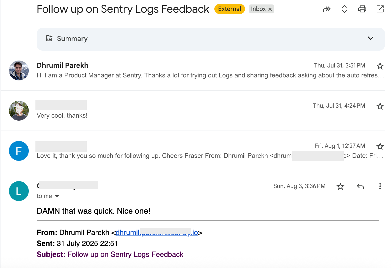 Sentry では、私たちは公開の場で開発を行い、迅速に対応しています。しかし、スピードを重視することで、最初の試みで全てがうまくいくとは限りません。そこで役立つのがフィードバックです。フィードバックはうまくいっている点を検証し、不足している部分を特定し、エラートラッキングだけでは把握できない問題を明らかにする助けになります。