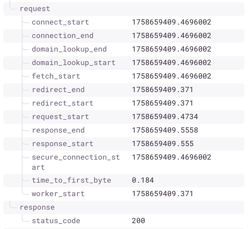 幸いにも、ブラウザは(ほぼ)すべてのリソース要求に対してリクエストのライフサイクル全体を公開してくれています。そこで、各リソーススパンについて利用可能なすべてのタイミング情報を収集するようにしました。たとえば、ドメインルックアップに要した正確な時間、リクエスト開始時刻、レスポンス受信時刻などです。さらに、リソーススパンに対して “Time to First Byte”(TTFB) も送信します。詳細なネットワークタイミング情報は、遅い CDN や、リクエストライフサイクルの中で特定のボトルネックになっている部分を突き止めるのに役立ちます。
