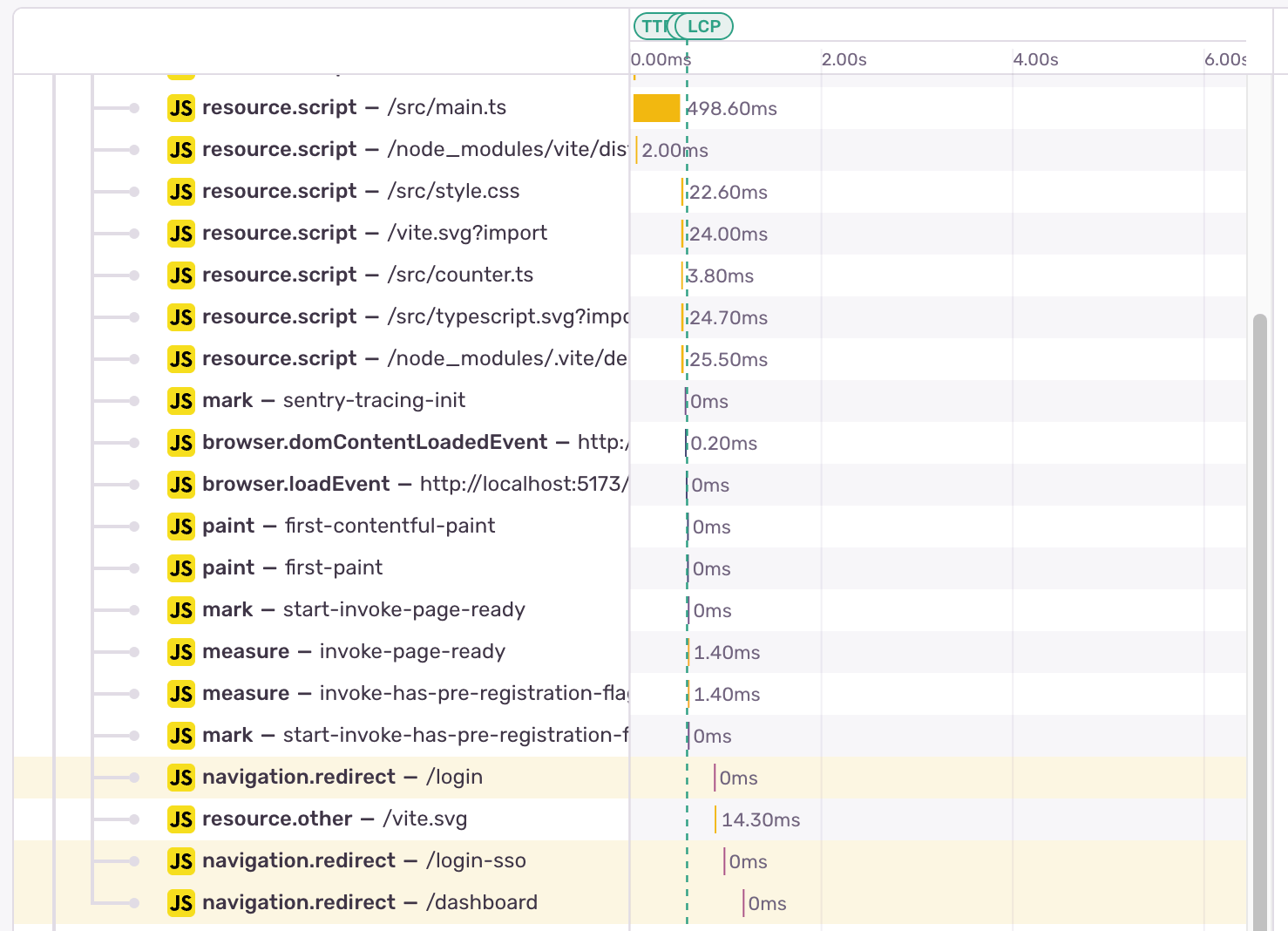 私たちの SDK での一般的な課題は、クライアントサイドのルーターによる自動リダイレクトとユーザー発のナビゲーションを区別することです。たとえば、React Router や Angular のルーターが未認証ユーザーをログインページへ送るのは「自動リダイレクト」です。これはたいてい、進行中の pageload やナビゲーションの最中に起きるため、新たな分離したルートスパンツリーを開始すべきではありません。対して、リンククリックなどのユーザー発ナビゲーションは、新しいナビゲーションのルートスパンを開始すべきです。