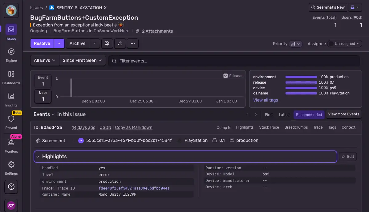 これにより、Sentry のエラートラッキングの全機能がゲーム機にも提供されます。SDK は scope をネイティブ層へ自動的に同期するため、ゲームがゲーム機上でクラッシュした場合でも、取得された issue には C# の適切な行番号を含む完全なスタックトレースが付与されます。
