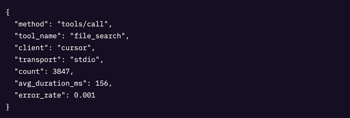 MCP サーバーは複数のトランスポート(stdio、HTTP、SSE)を横断して、1分あたり数千リクエストを処理することもあります。ログにはメソッド名は出ますが、コンテキストがありません。tools/call は至るところで見えるけれど、どのツールなのか、どのクライアントからなのか。、どのトランスポート経由なのかが分からない。