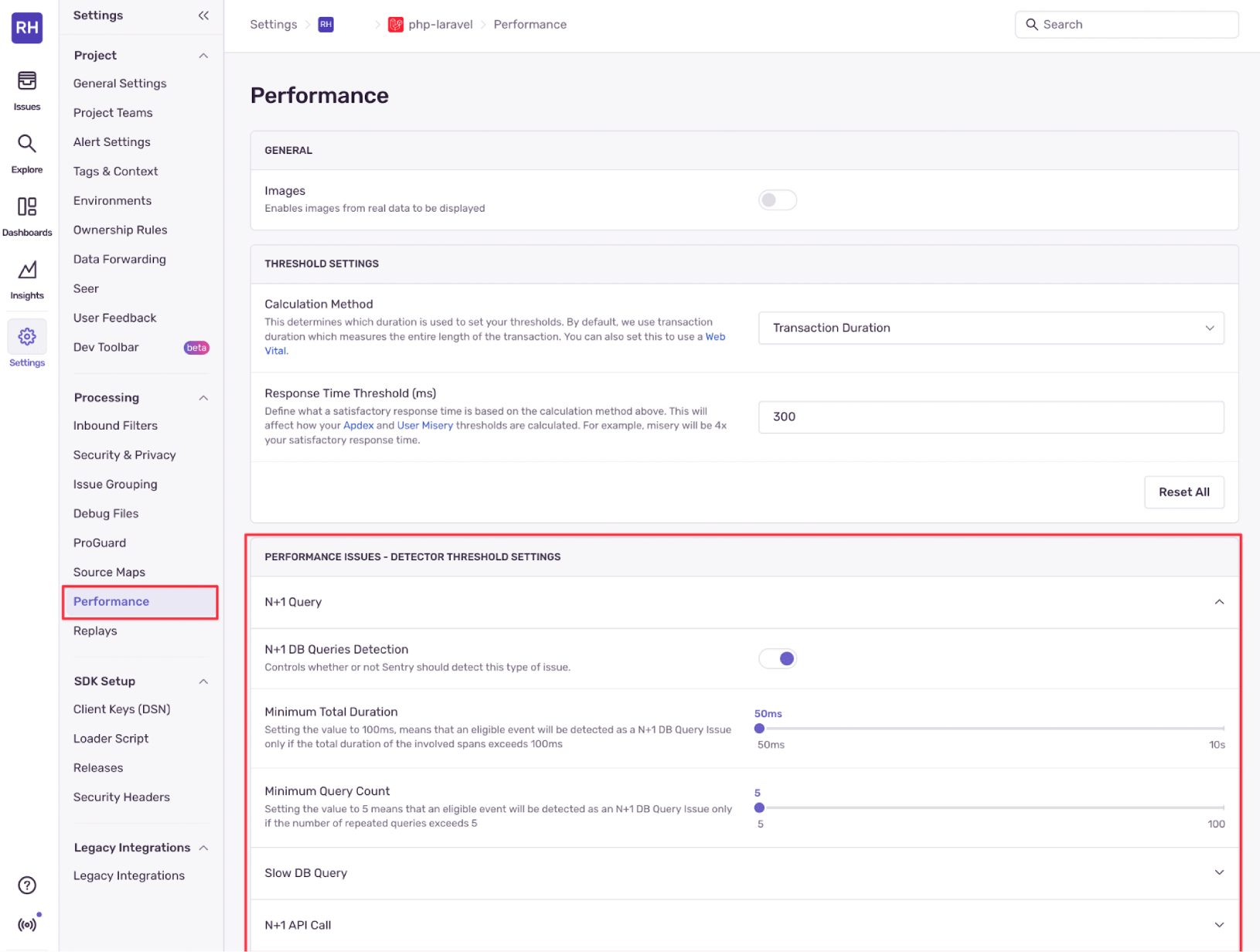 Sentry のアラートを細かく調整するには、ダッシュボードで Settings → Projects → [Your Project] → Performance に移動してください。すべての設定オプションは Performance Issues – Detector Threshold Settings にあります。