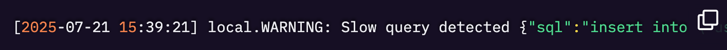 データベースは、各受信 HTTP リクエストの所要時間を測定し、リクエストが長すぎる場合には laravel.log に警告をログします。ログエントリには、URL、メソッド、ユーザーID、IP アドレス、メモリ使用量メトリクスといったメタデータが含まれます。