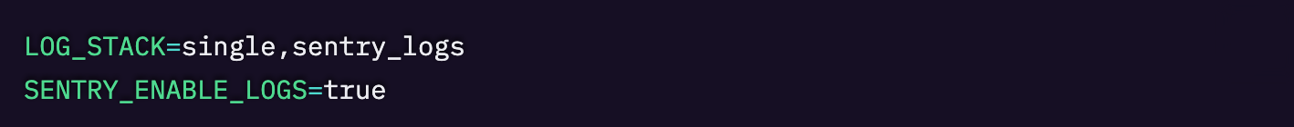 .env ファイルで、LOG_STACK 設定に ,sentry_logs を追加して新しいドライバを有効化し、さらに Sentry のログ設定を有効にしてください。