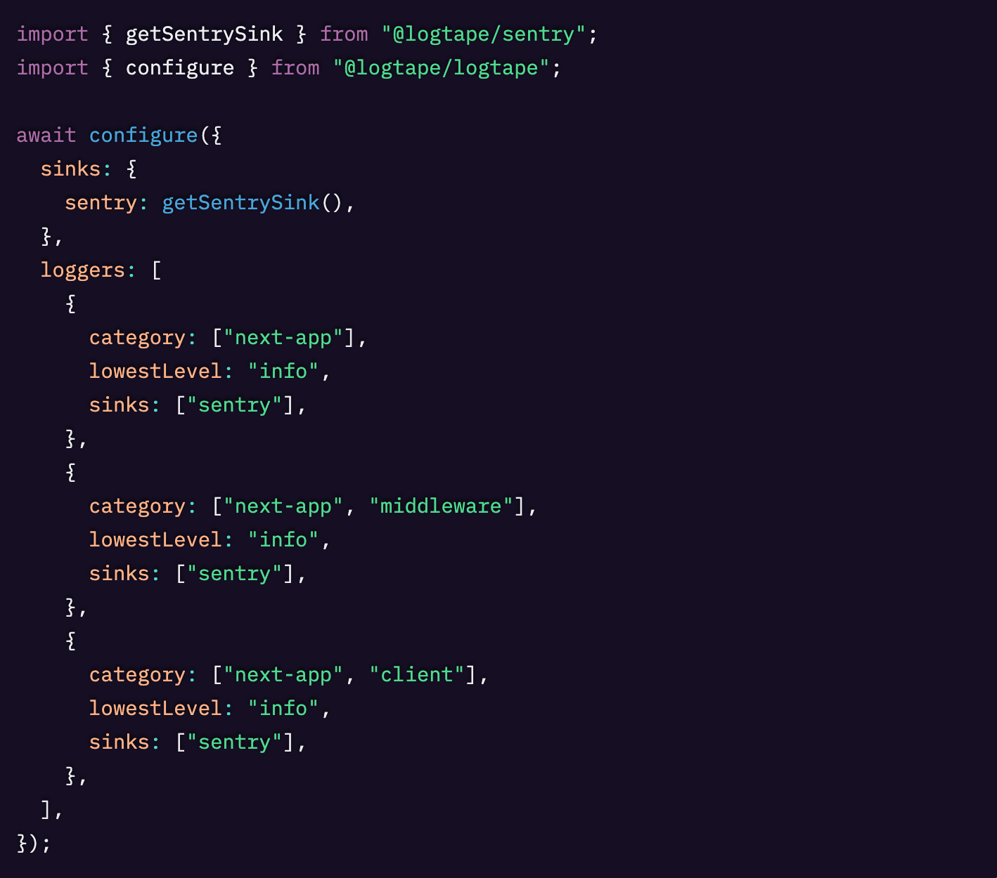 そのうえで、前述のようにSentryのロガーを使用するか、LogTapeのような既存のロガーと統合します。