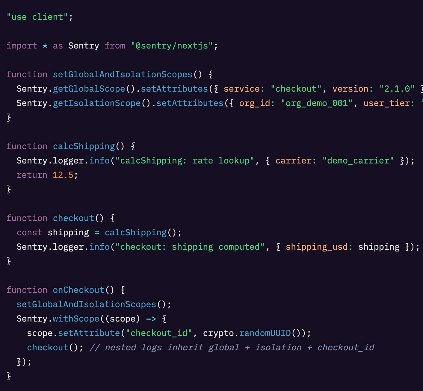 Sentry.withScopeを使用すると、コールバック内で出力されるすべてのログに自動的に含まれるコンテキストデータを設定できます。