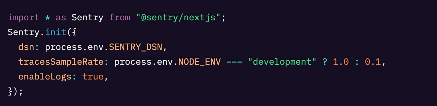 リクエストごとに1つの相関ID(通常はTrace ID)を生成し、Edge、Node、ブラウザのすべてのログに付与する必要があります。これは上記課題 3で説明されている内容であり、上記のSentry設定(sentry.edge.config.ts、sentry.server.config.ts、instrumentation-client.tsの初期化)によって実現されます。これにより、ランタイムをまたいで1リクエストにつき1つのトレースが作成されます。可観測性基盤にこのIDを伝播させることで、各ファイルごとにヘッダーやロガーフィールドを手動で扱うよりも効率的に管理できます。