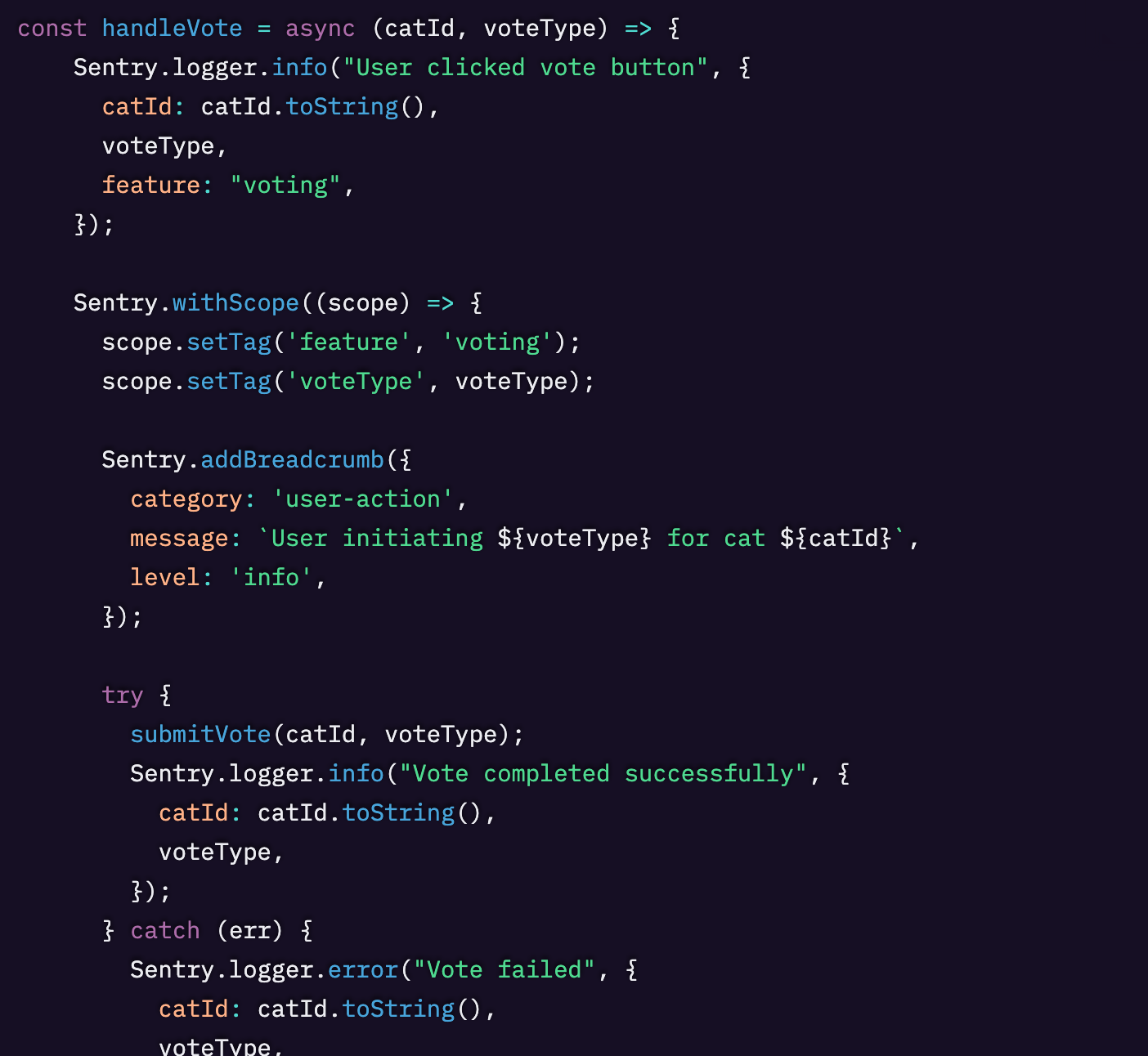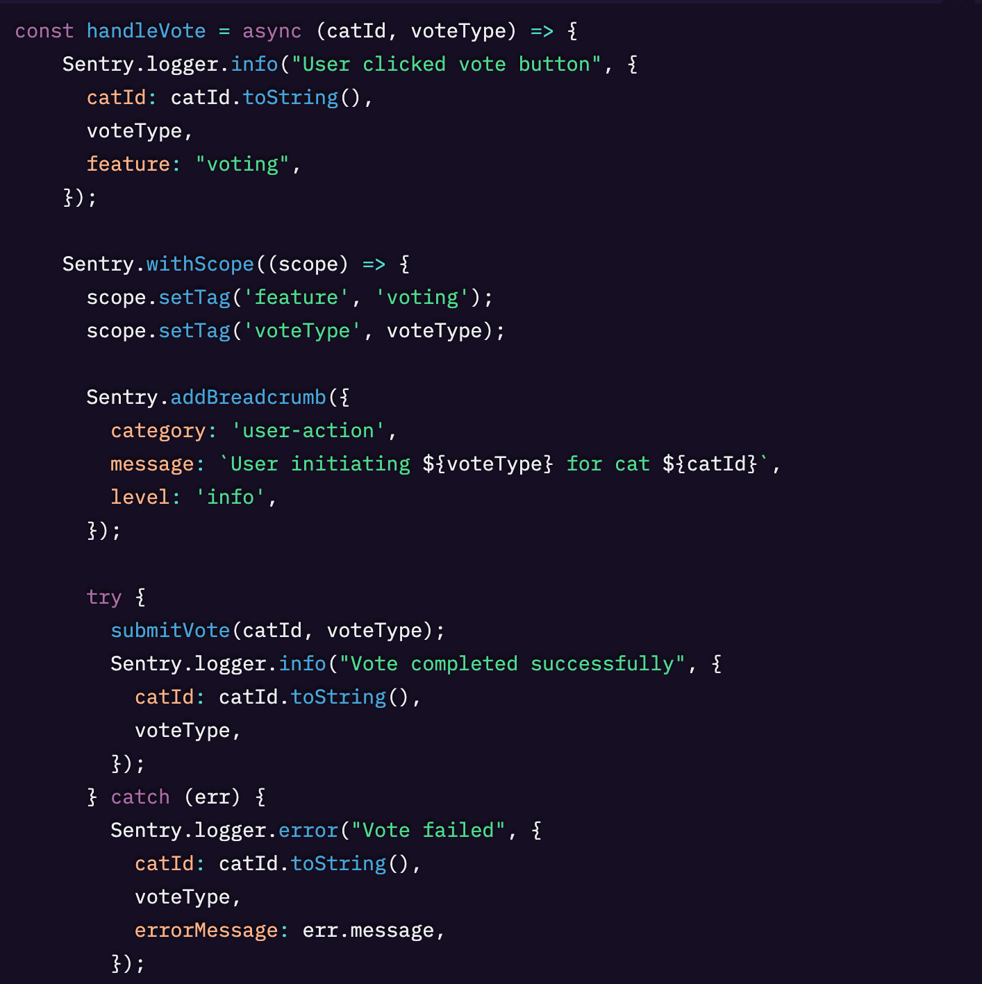 frontend/src/screens/CatListScreen.js では、ユーザーが猫に投票したタイミングをログします。logger API と breadcrumbs の両方を使って、ユーザーが何をしたかの足跡(トレイル)を残します。