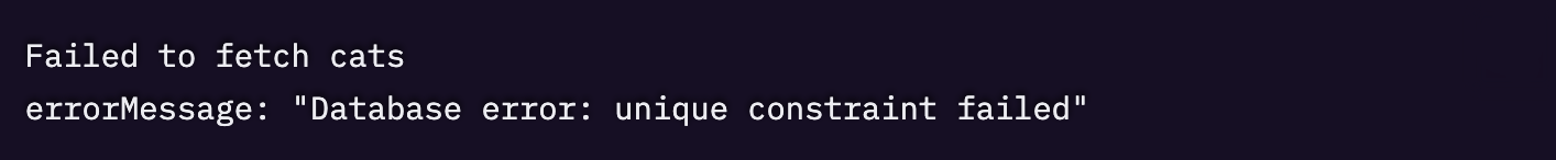 これで、問題がバックエンド側にあることが分かりました。同じタイムスタンプ付近のバックエンドのサーバーログを確認すると、データベースの制約エラーが見つかりました。バックエンドは投票を挿入しようとしましたが、外部キー制約違反(cat ID がデータベースに存在しない)により拒否されていました。