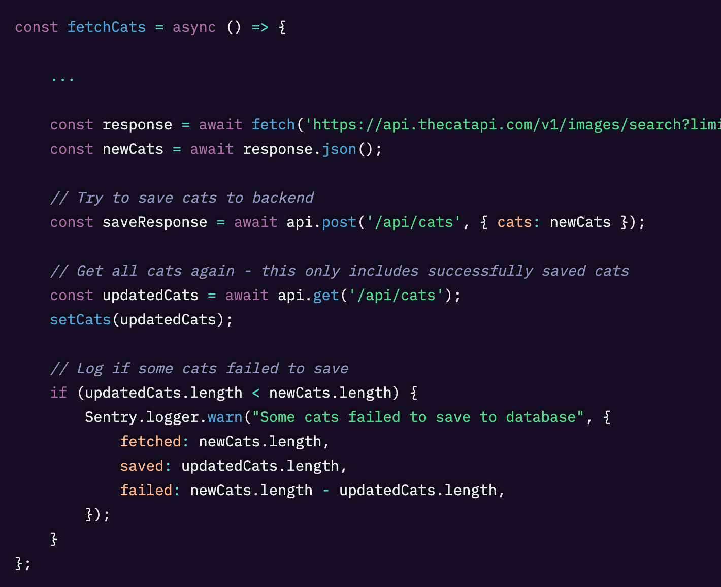 Sentry の Logs に戻り、この猫がいつ追加されたのかを検索します。operation:fetchCats で絞り込むと、アプリが外部 API から猫を取得していたことが分かります。しかし、データベースに保存しようとした際に、リクエストのうち 1 つが失敗していました。Sentry のログには次のように表示されています。