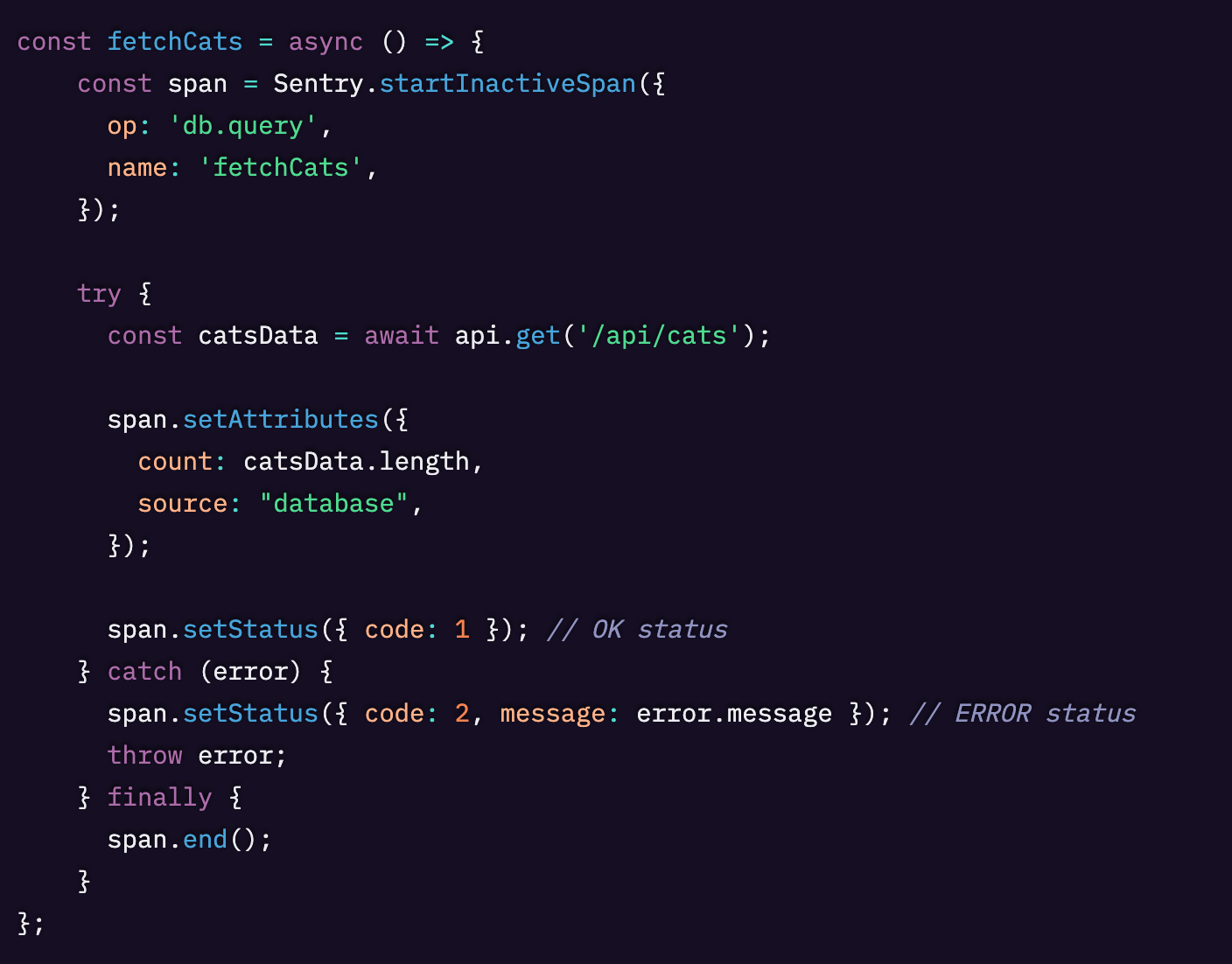 エラーに加えて、Sentry の spans 機能を使えばパフォーマンスも追跡できます。frontend/src/context/CatsContext.js では、猫の読み込みにどれくらい時間がかかっているかを計測できます。