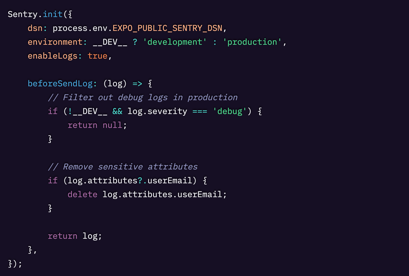 beforeSendLog 関数を使うと、Sentry に送信する前にログをフィルタできます。Sentry に届くデータを細かく制御できるため、十分なログを確保しつつ、ダッシュボードをノイズで埋めないようにバランスを取るのに役立ちます。