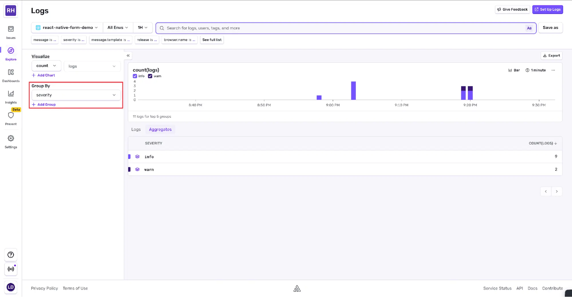 ログはログレベルごとに整理されたので、各 severity にどれだけログがあるかを把握しやすくなりました。環境、ブラウザ種別、またはログに追加した任意のカスタム属性でもグルーピングできます。