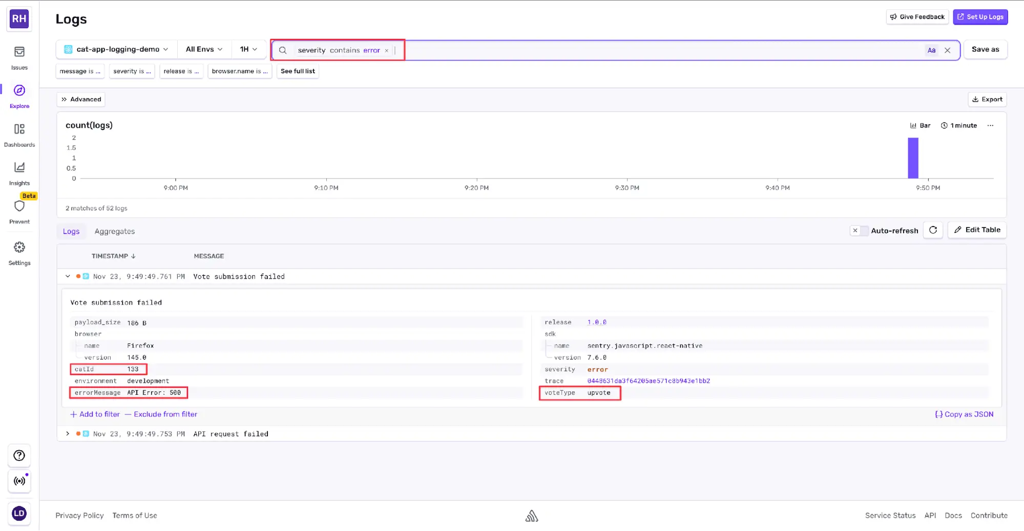 Logs からは、ユーザーが猫一覧を読み込み、upvote ボタンをクリックし、その後 API リクエストが 500 の HTTP ステータスコードで失敗したことが分かります。