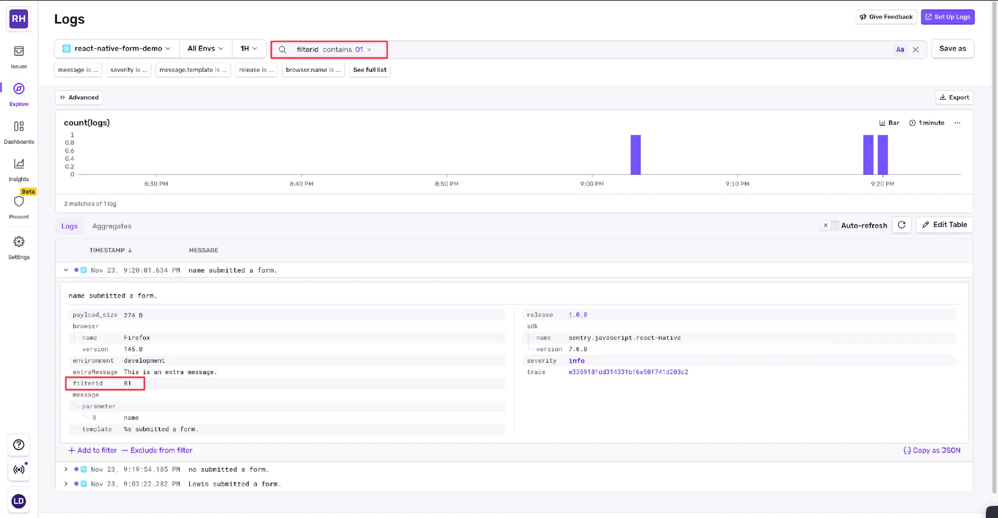 フォームを送信すると、ログのペイロードに新しい filterID と extraMessage の両方のフィールドが表示されます。
