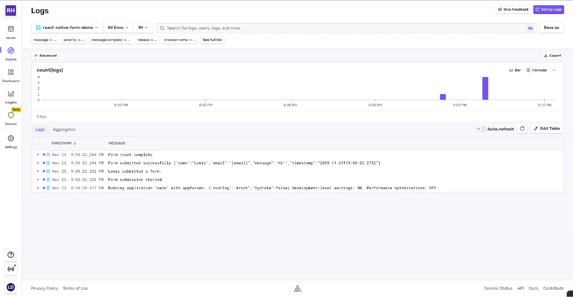 このガイドでは、シンプルな React Native(Expo)アプリを使って、Sentry のさまざまなロギング機能の例を示します。