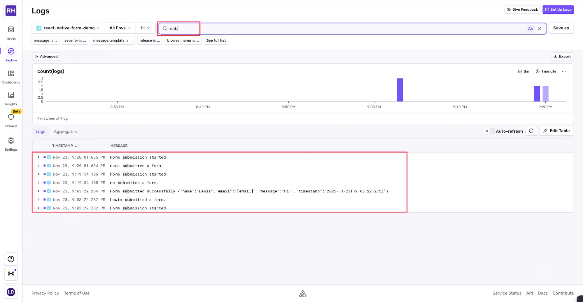 ではアプリを再起動し、フォームに入力して、送信されるログを確認してみましょう。