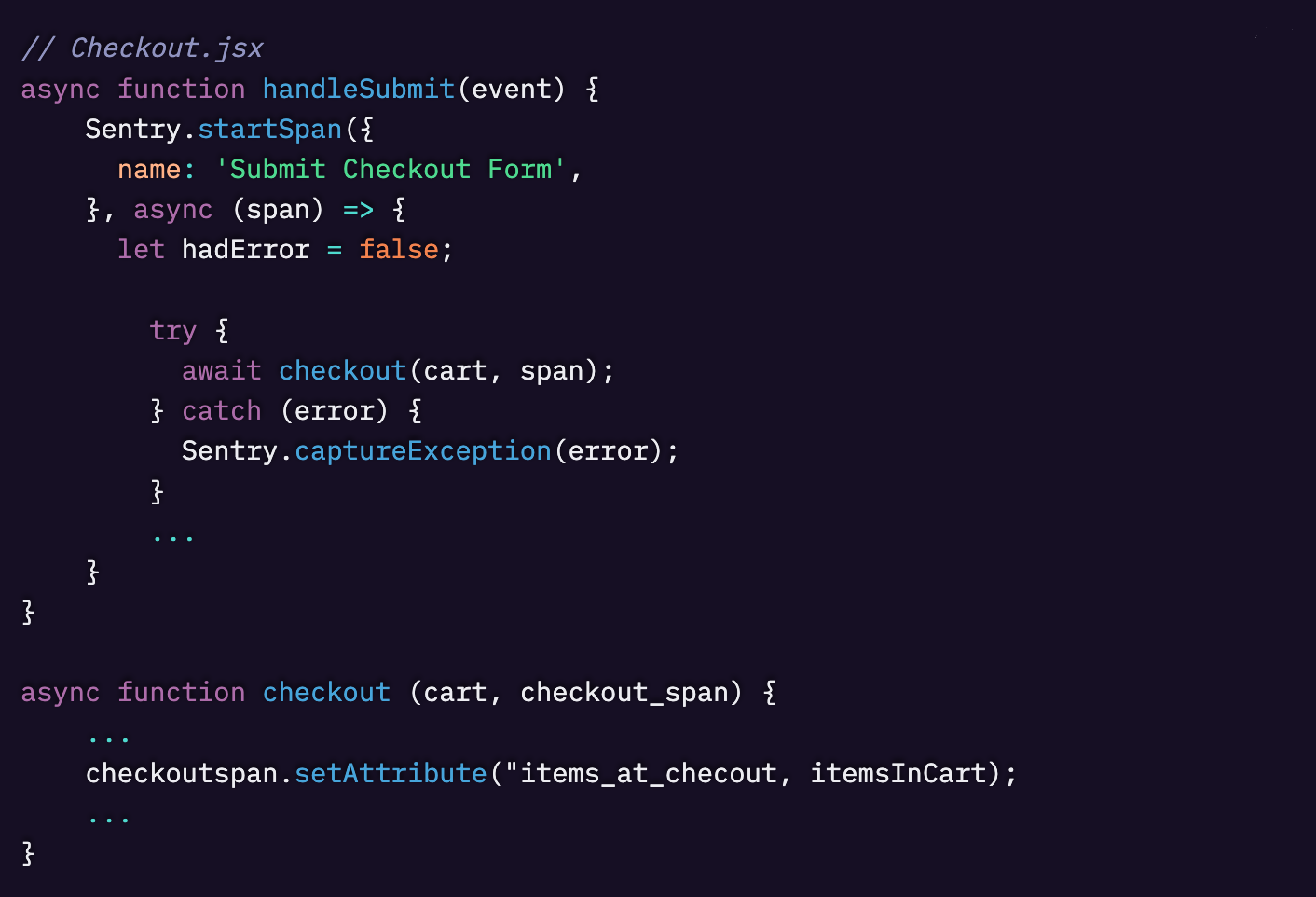 まず、Sentry.startSpan() でスパンを作成し、次に checkoutspan.setAttribute を使って items_at_checkout を属性として追加します。ここにデバッグやパターン分析のために顧客データなど他の有用な情報を付与することも簡単にできますが、ここではシンプルに留めることにしました。