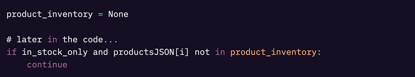 ありがちな“vibe coding”のうっかりミスです。product_inventory を空の配列にする代わりに None で初期化していたため、反復処理が不可能になっていたのです。