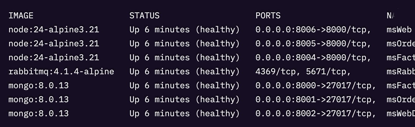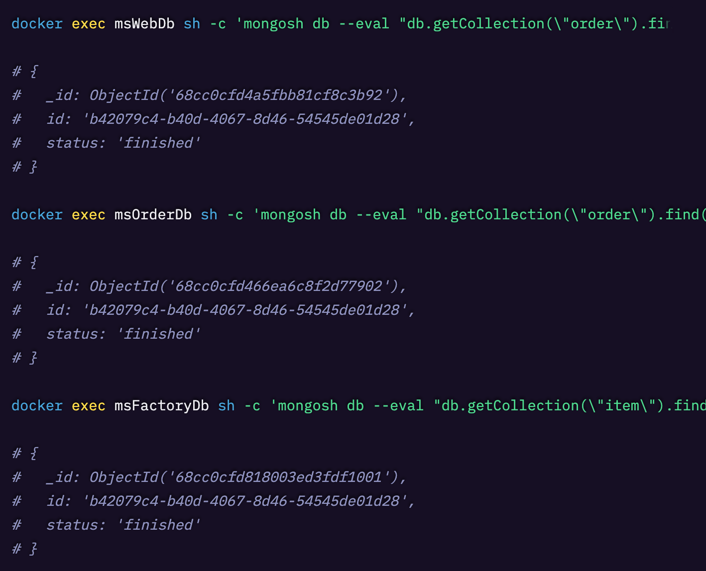 - MongoDB データベースが3つ(Docker Composeファイルの先頭付近にある msWebDb、msOrderDb、msFactoryDb)
