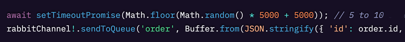 - web サービスはその注文IDを RabbitMQ 上のメッセージとして order サービスに送信しました。