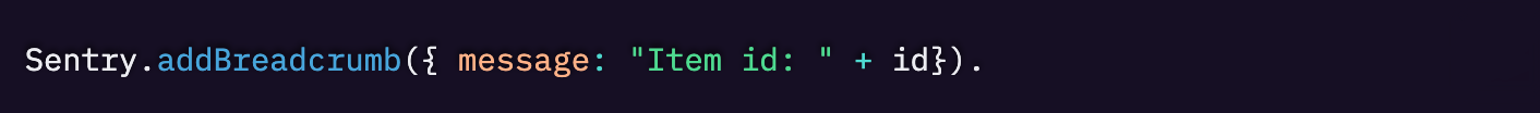 例外のスタックトレースにはサービス横断のコンテキストが含まれないため、エラーを送信する前に orderId のような識別子を付けておくことが重要です。その方法のひとつが、breadcrumb を使うことです。
