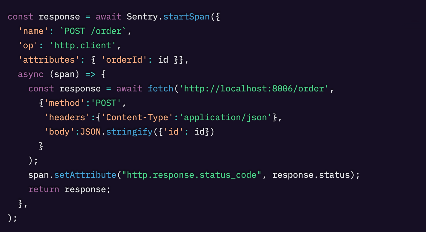 startSpan() 関数は、内部で行われる呼び出しを記録する span を手動で作成します。この例では、fetch(‘http://localhost:8006/order’) の呼び出しが記録されます。必須なのは name パラメータだけですが、このコードでは注文IDを属性として含めており、さらに呼び出しが完了した後に、レスポンスのステータスコードも属性として追加しています。