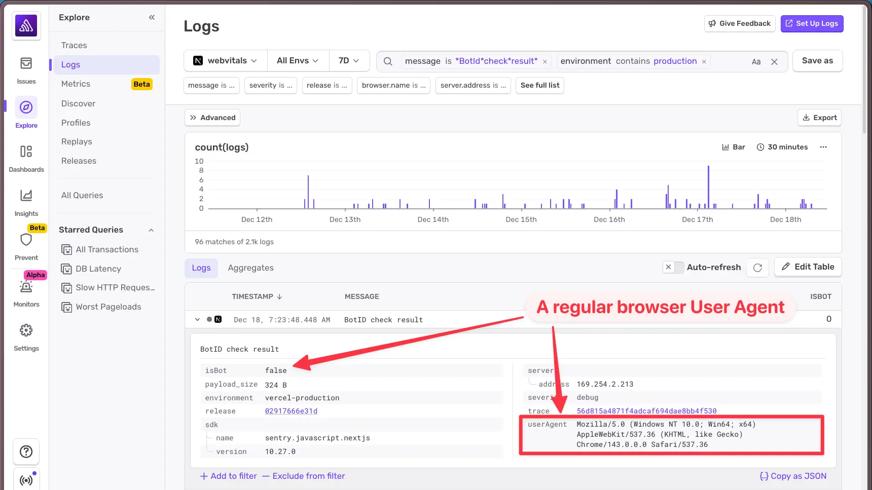 次に、失敗したリクエスト(isBot: 1)を確認しました。ユーザーエージェントは想定していたものではありませんでした。