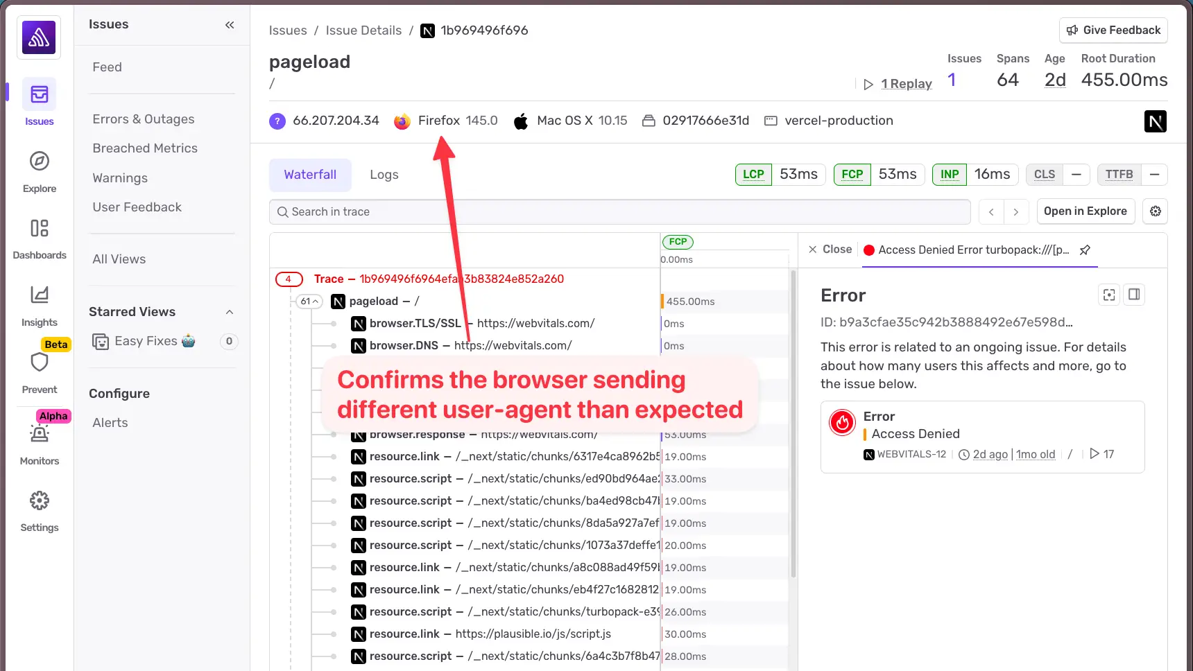 Logs 単体でも有用ですが、Logs から完全なトレースへ(またはその逆へ)飛べると、全体像が手に入ります。今回の場合は AI SDK のユーザーエージェントが Firefox のリクエストから来ていることを確認できました。