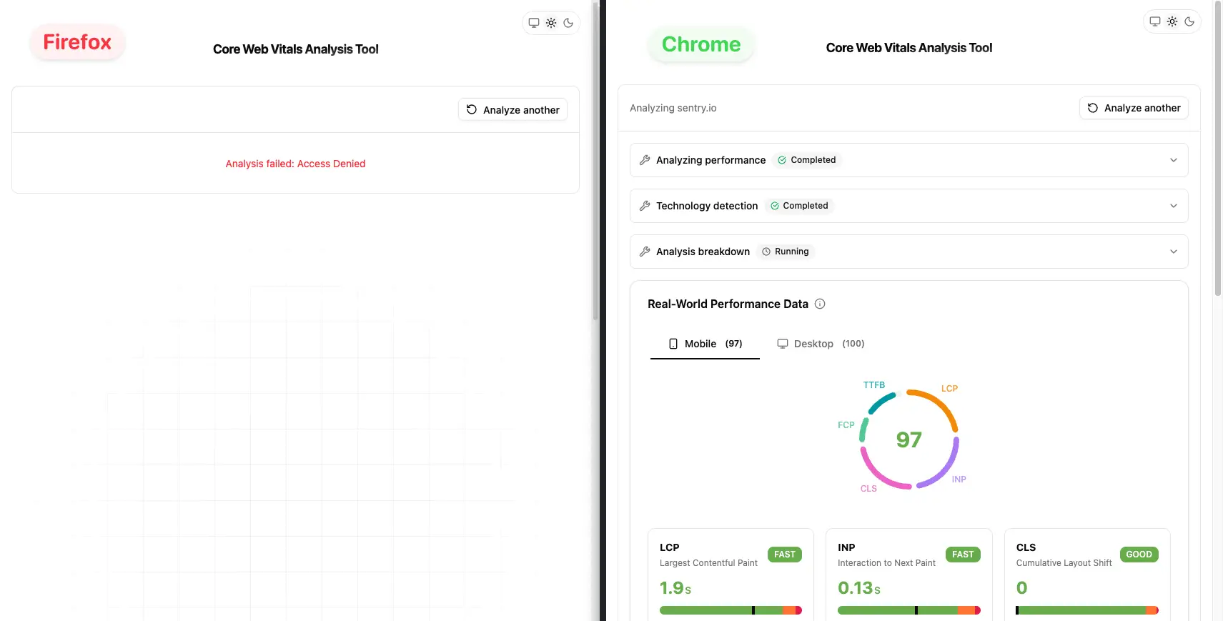 修正を試み、何度もリリースし、何度も試しましたが、それでもエラーは繰り返し戻ってきました。スタックトレースも役に立ちません。分かるのはこれらのブラウザに対してボット判定が true になっている、ということだけです。なぜ Chrome ではなく Firefox と Safari がボットとして判定されるのか…