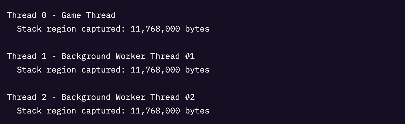 Windows では、スレッドスタックは通常 1MB が予約され、そのうち実際にコミットされて使われているのは 4〜64KB 程度です。今回のダンプでは、各スレッドで 10MB 以上がキャプチャされていました。典型的なゲームでは 50 スレッド以上あるため、スタックだけで 500MB 超になり、さらにヒープメモリ、読み込まれたモジュール、その他の状態が加わることになります。